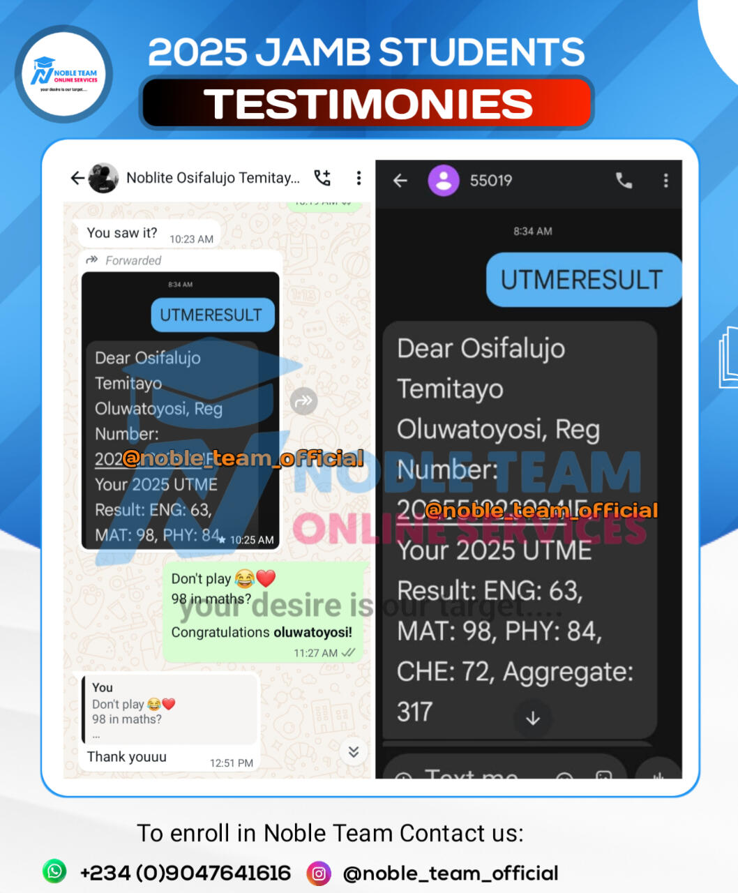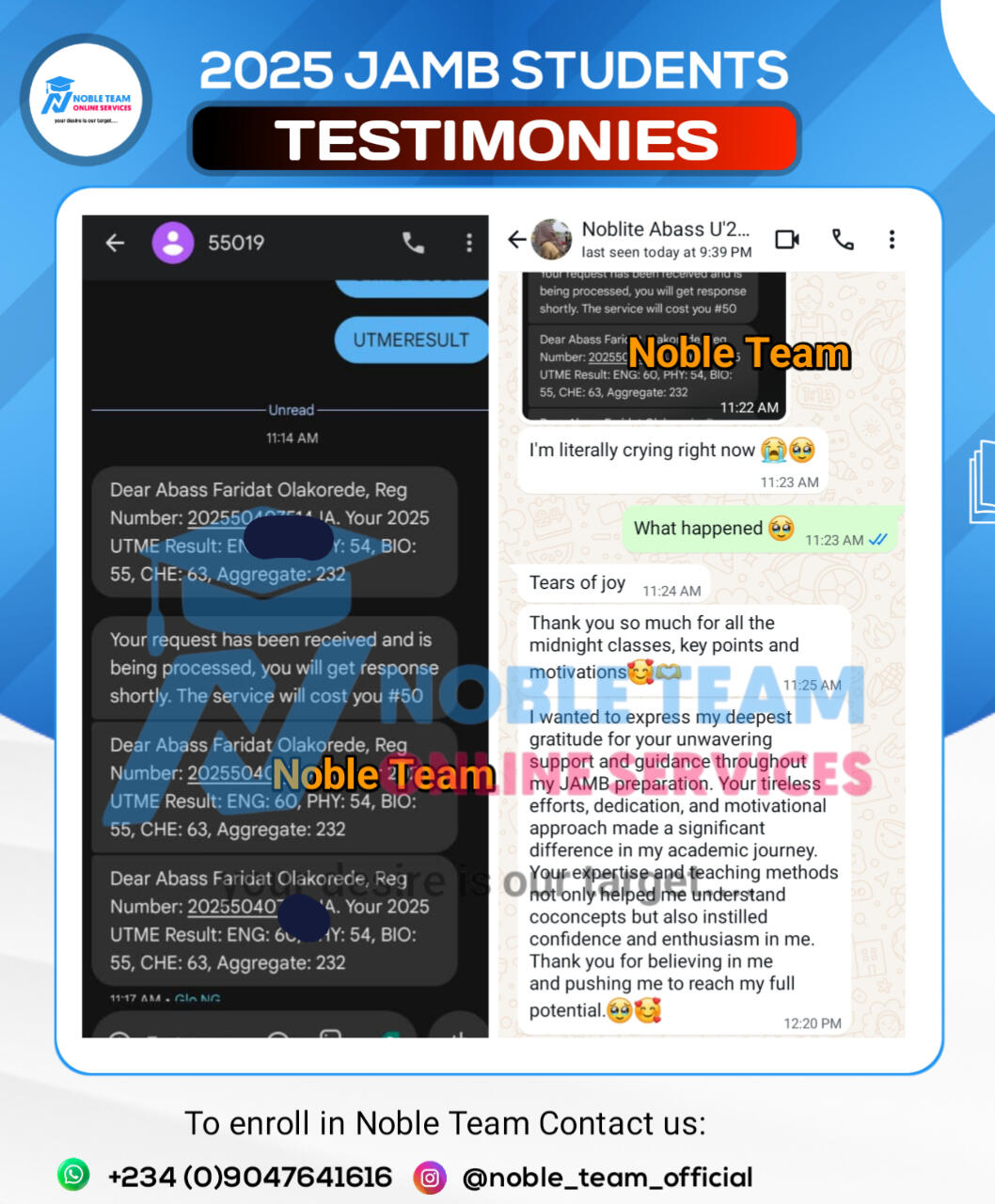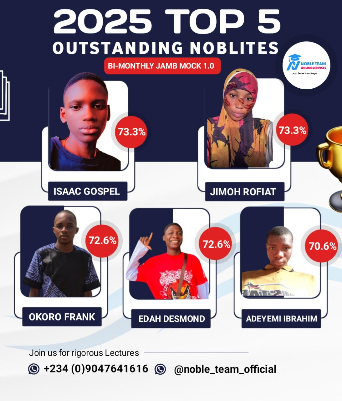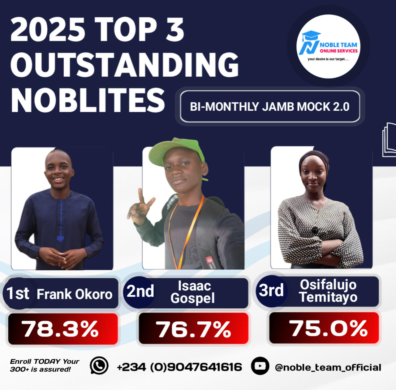 Check out the top scholars from the 2025 Standard Bimonthly Mock Exams 1.0 & 2.0 conducted by Noble Team. Impressive, right?Now you can see why joining Noble Team 2026 JAMB Classes gives you so many advantages. Missing out would really put you at a disadvantage.Regret is toughâespecially when you had a clear way to avoid failure but didnât take it. Donât let that happen to you. Join our 2026 JAMB classes now and give yourself the best shot at success!