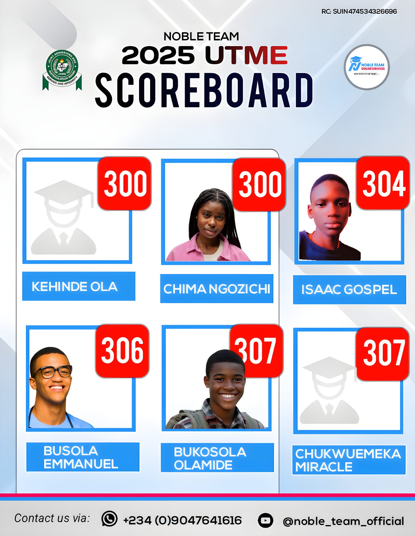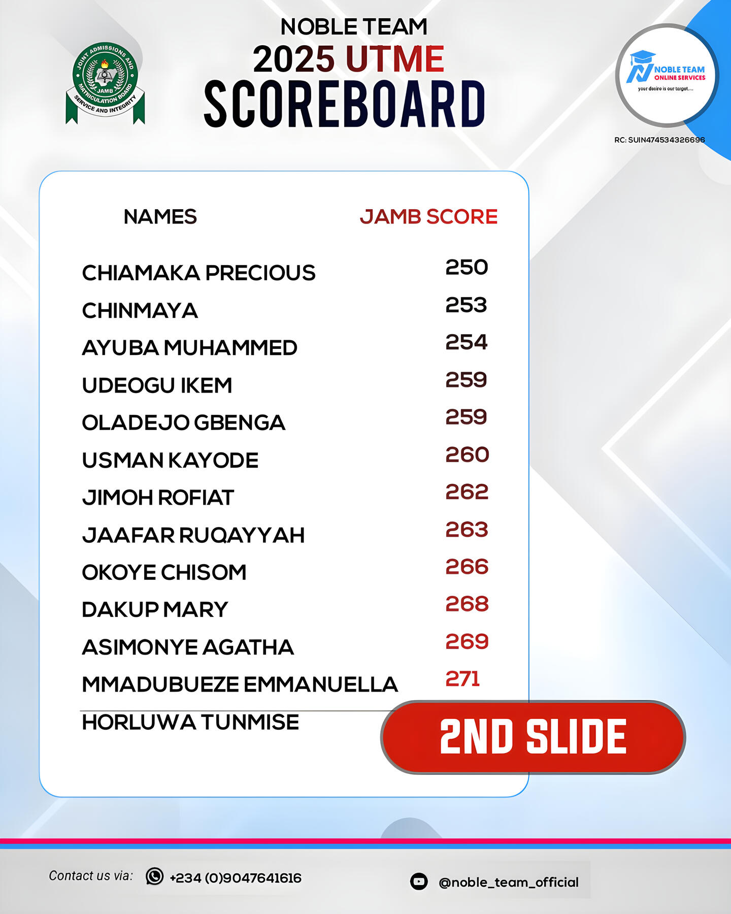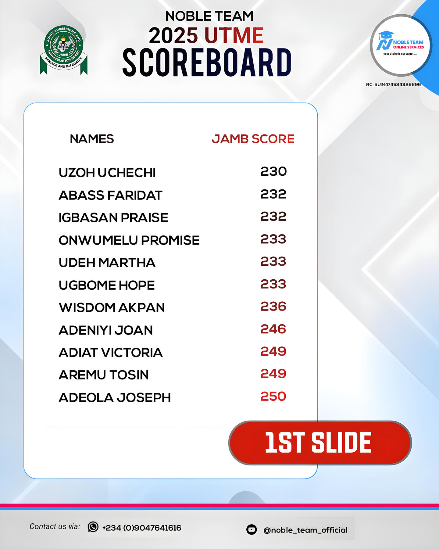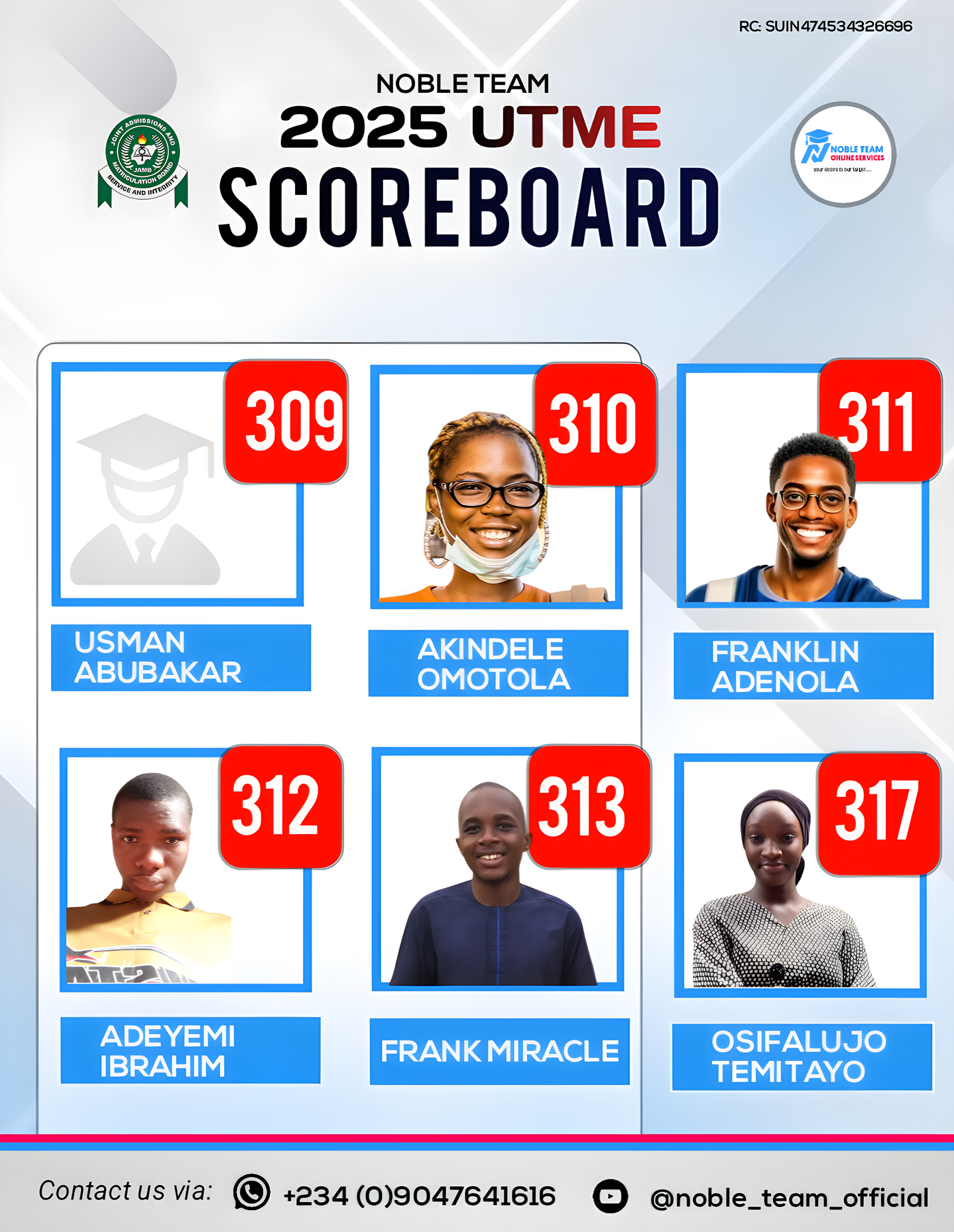 Check out the top scholars from the 2025 Standard Bimonthly Mock Exams 1.0 & 2.0 conducted by Noble Team. Impressive, right?Now you can see why joining Noble Team 2026 JAMB Classes gives you so many advantages. Missing out would really put you at a disadvantage.Regret is toughâespecially when you had a clear way to avoid failure but didnât take it. Donât let that happen to you. Join our 2026 JAMB classes now and give yourself the best shot at success!