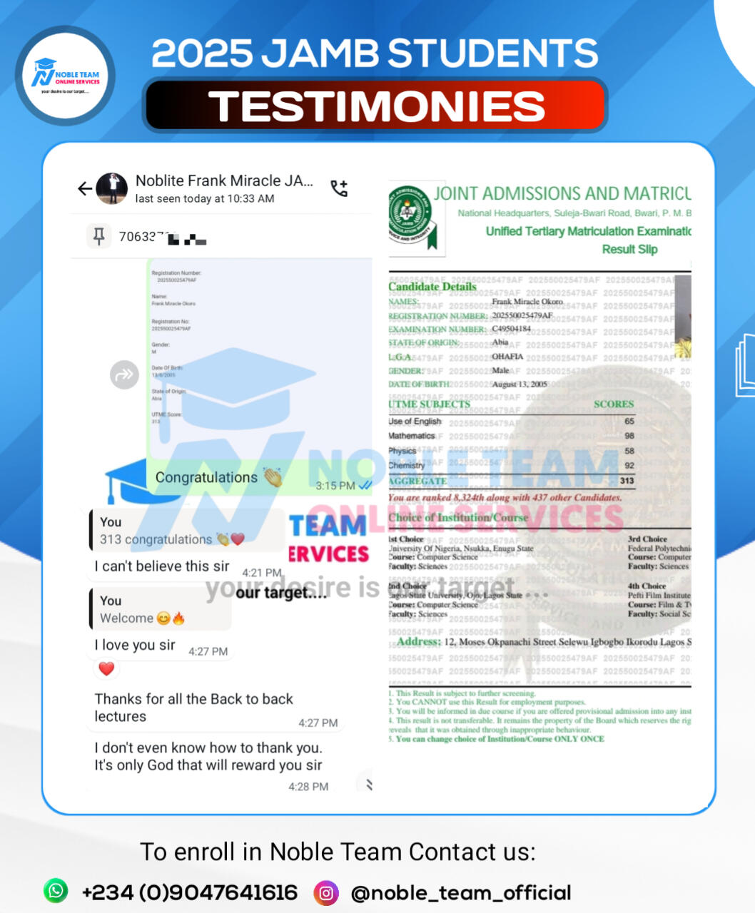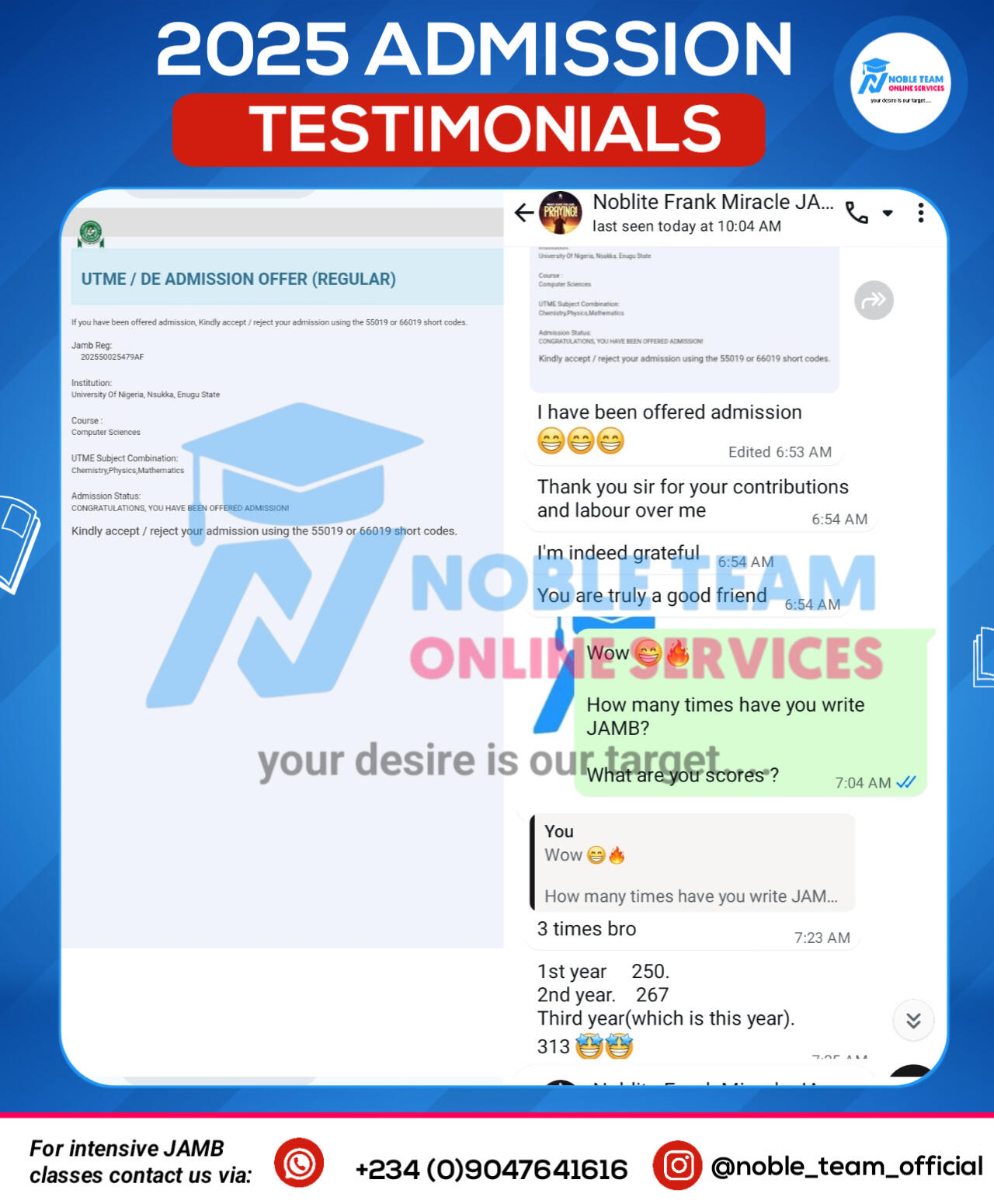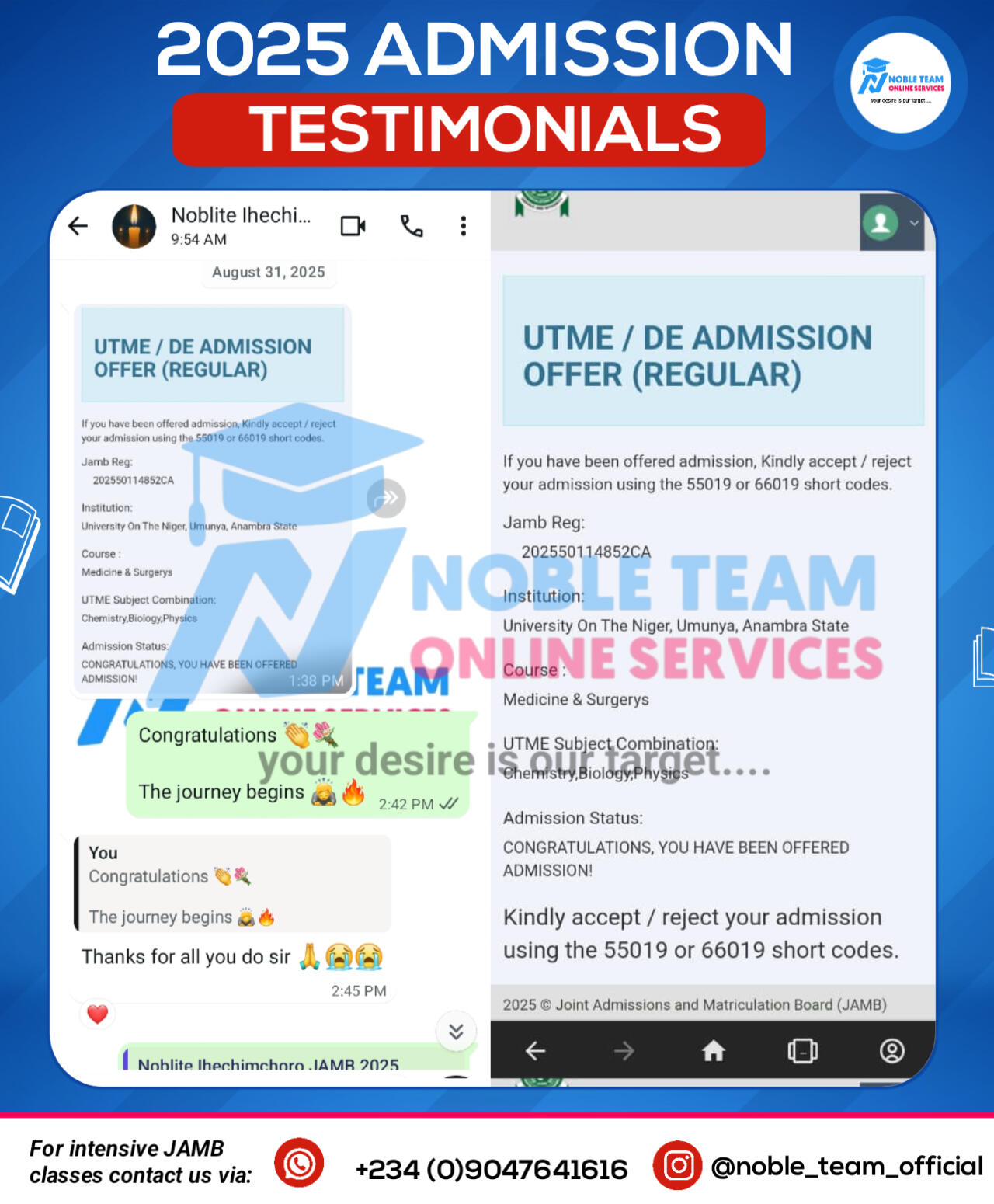 Don't you want to share your admission story like this in 2026?Then don't miss Noble Team 2026 JAMB classes, keep scrolling down to have full details about this powerful class and you'll be amazed to see all we have prepared for you to smash your 2026 JAMB exam once and for all.