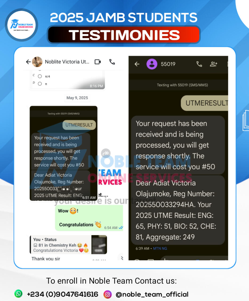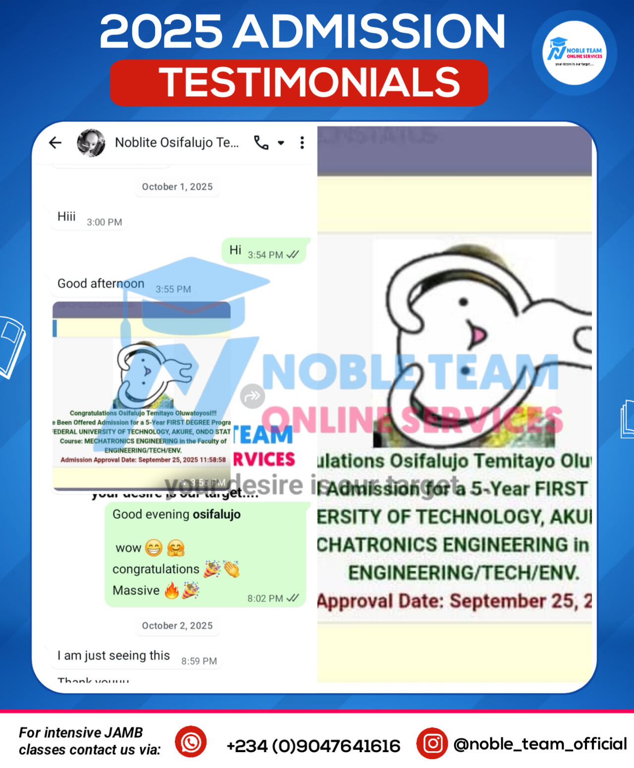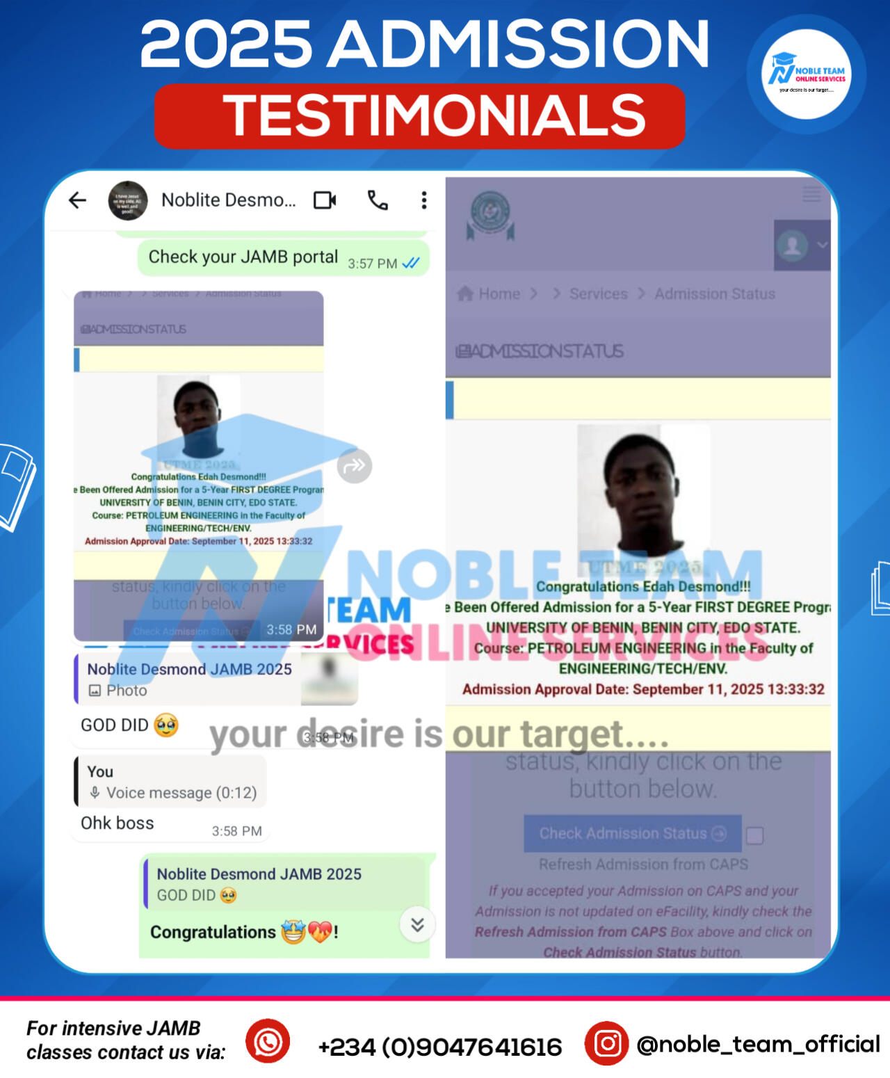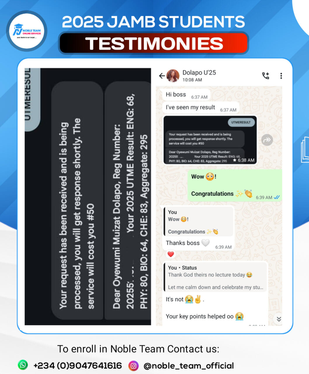 Don't you want to share your admission story like this in 2026?Then don't miss Noble Team 2026 JAMB classes, keep scrolling down to have full details about this powerful class and you'll be amazed to see all we have prepared for you to smash your 2026 JAMB exam once and for all.