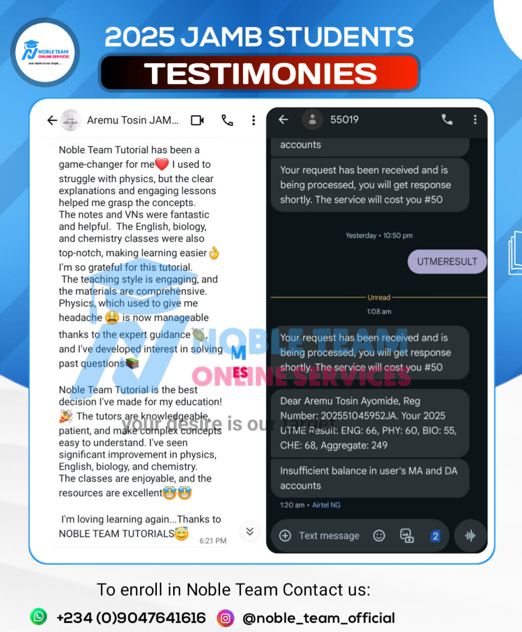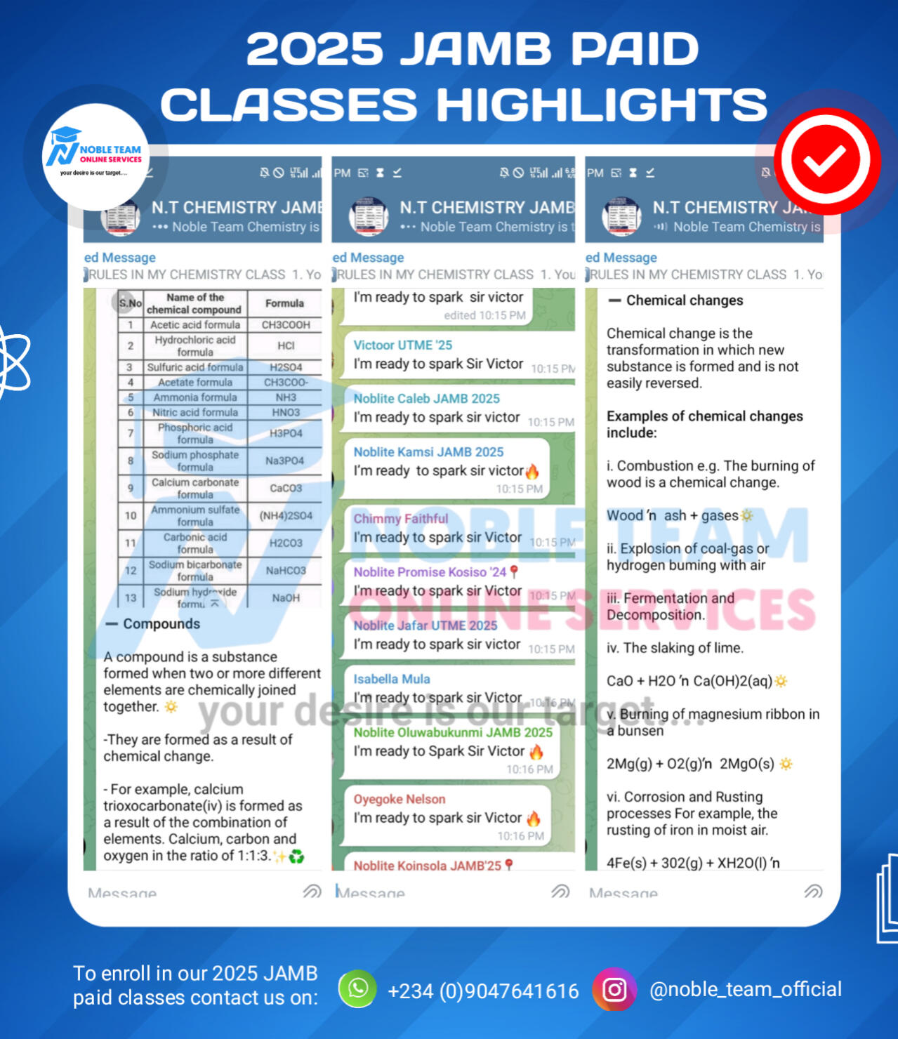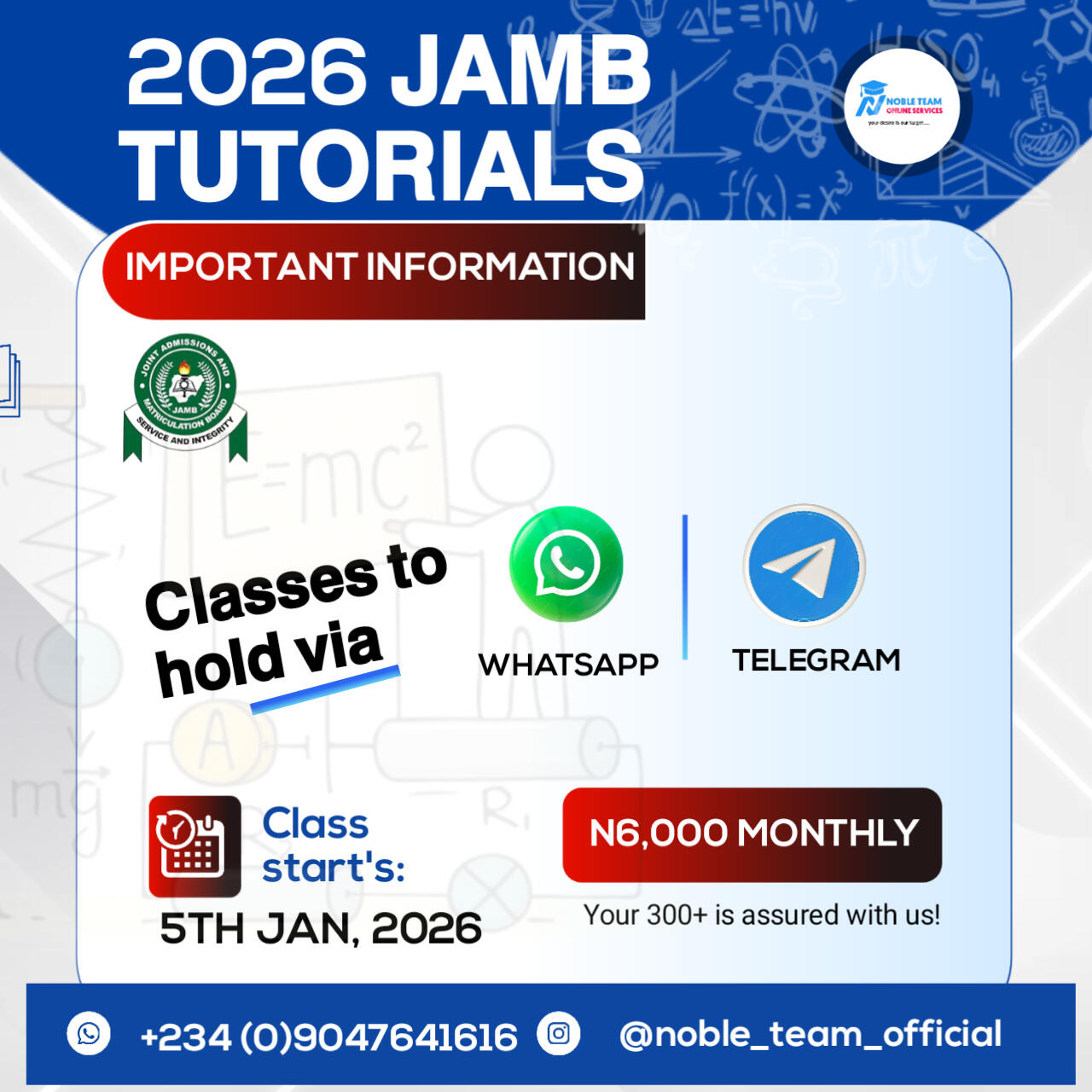 Join Noble Team 2026 JAMB Paid Classes today and give yourself the best chance to succeed. Donât leave your results to chanceâsecure your success and avoid the risk of failure!