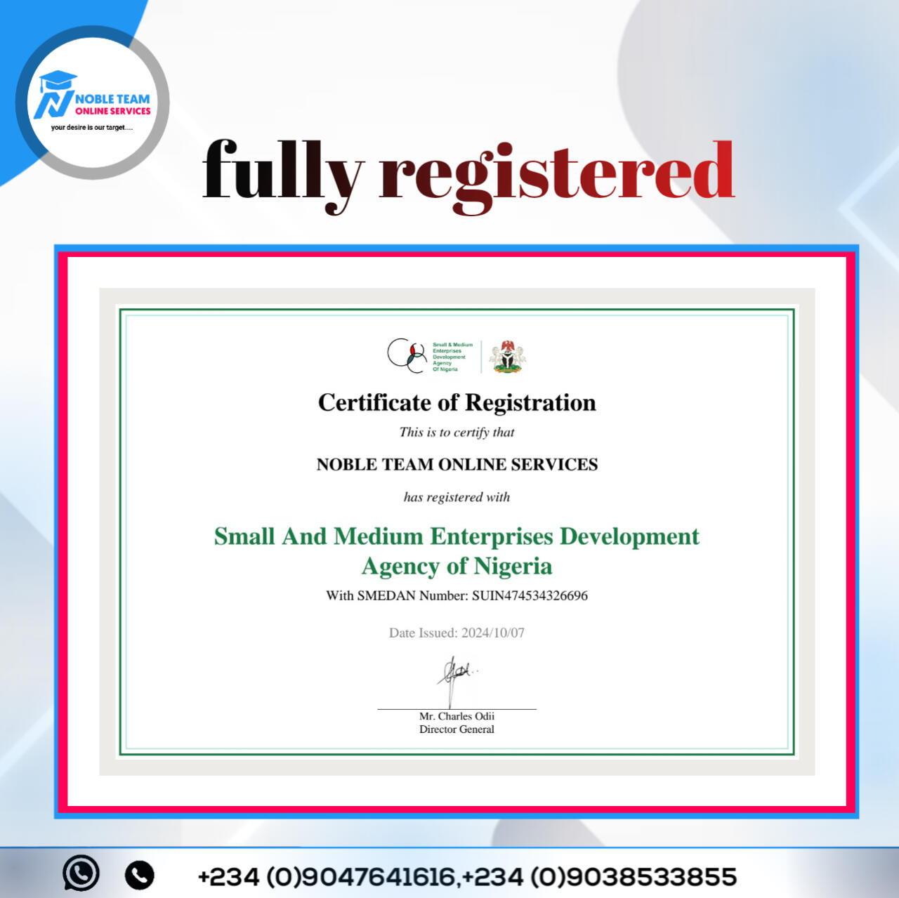 NOBLE TEAM ONLINE SERVICES is fully registered under SMEDAN with registration number SUIN474534326696