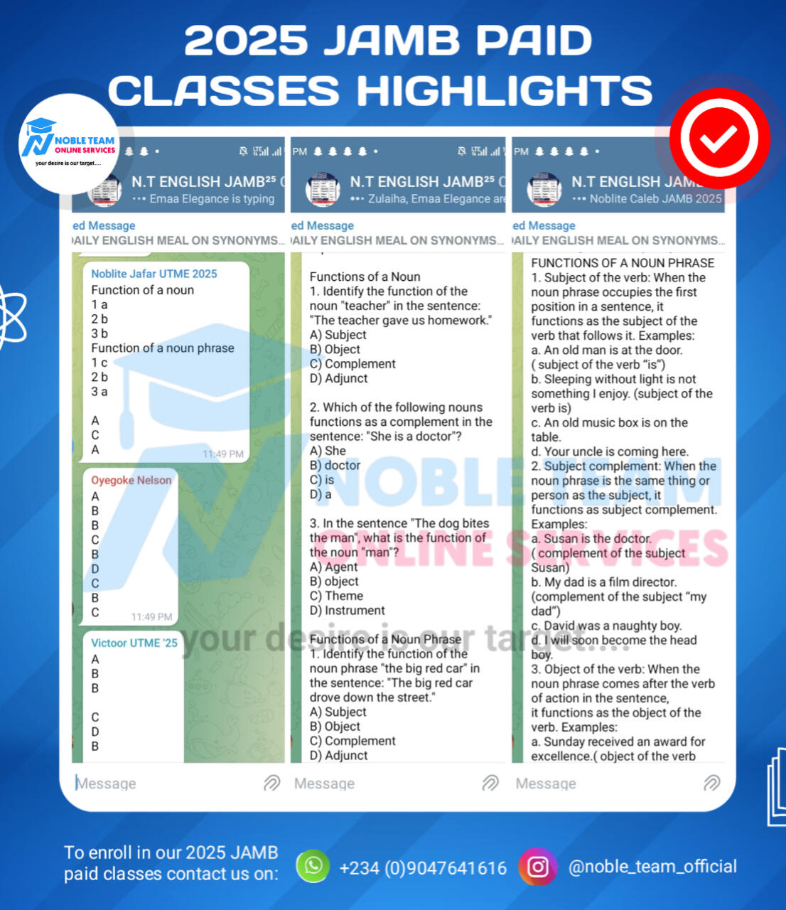 Noble Team 2026 JAMB Classes run on Telegram, WhatsApp, YouTube, and our standard mock exam portal, giving you multiple ways to learn and practice.â Our exclusive YouTube tutorials are just for our registered students. They make lessons easier to understand and faster to absorb, so you can really grasp every topic.