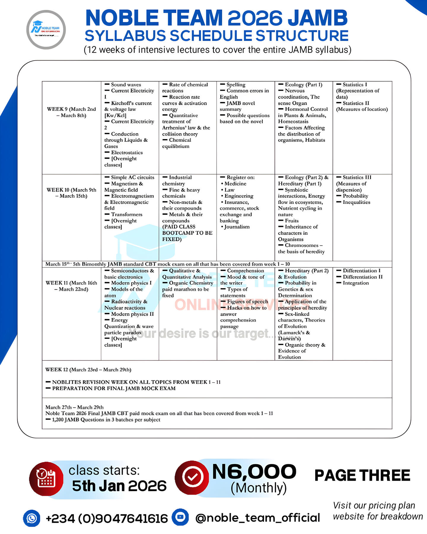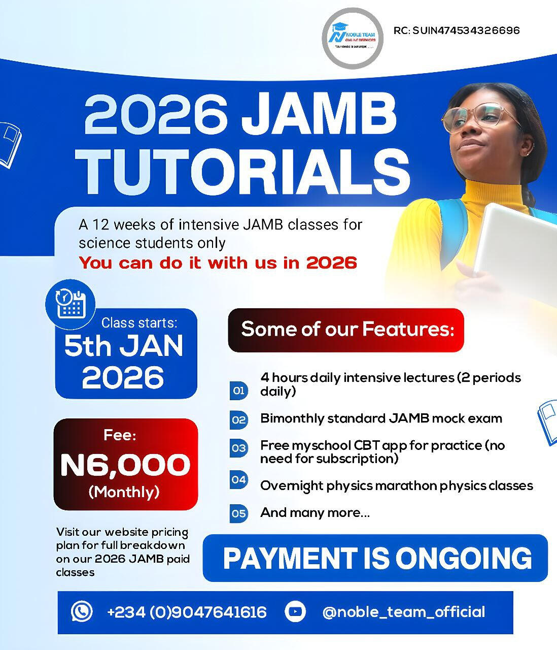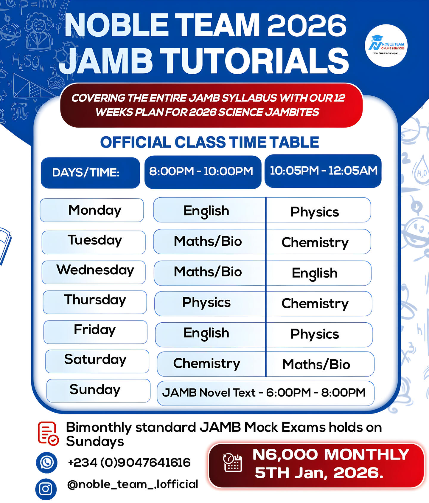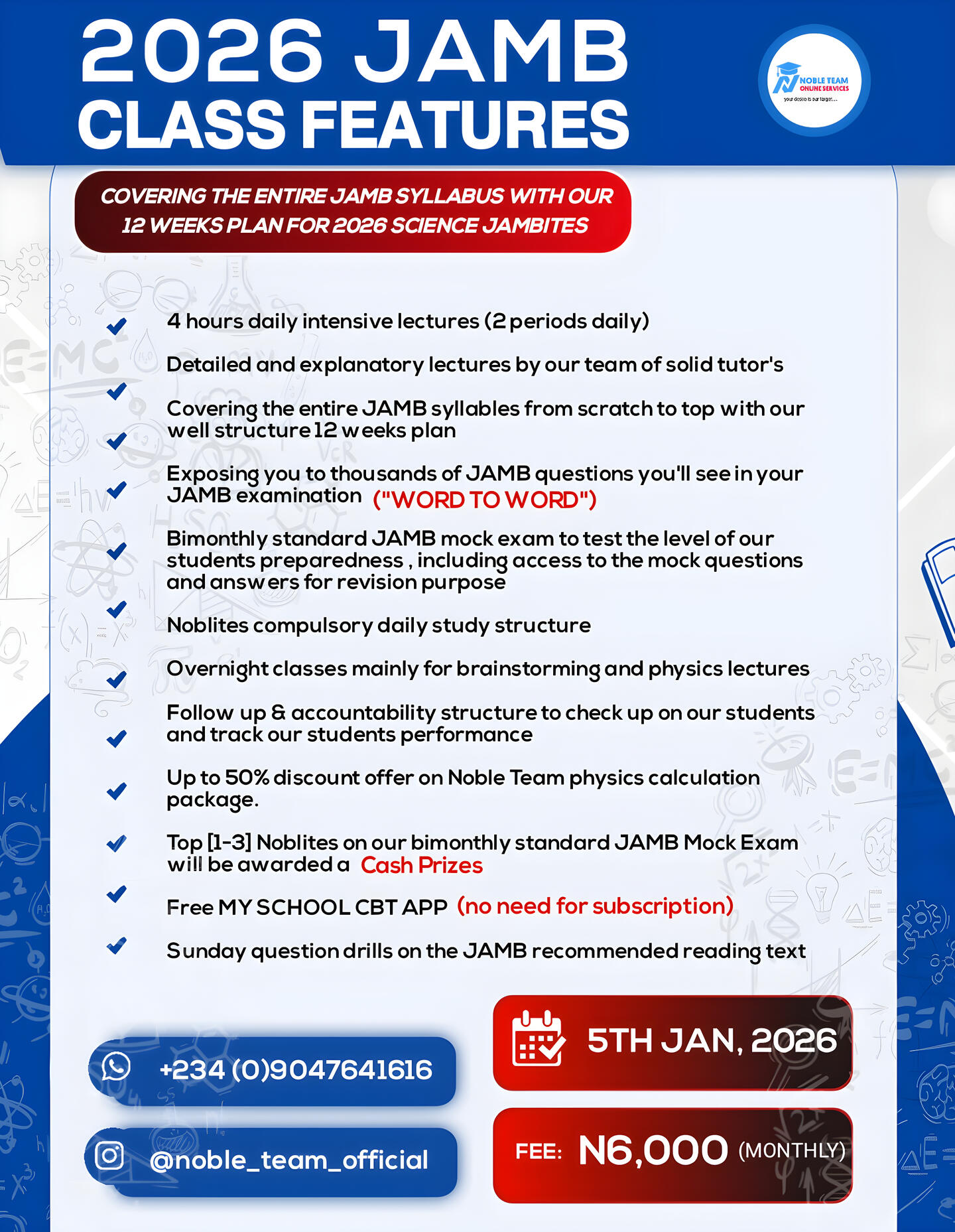 We provide top notch lecturersThe 2026 JAMB PAID Class at Noble Team will commence on January 5th, 2026. The program will run for 12 weeks (3 solid months) â from January 5th to March 29th, 2026 â and will be held online exclusively for science students