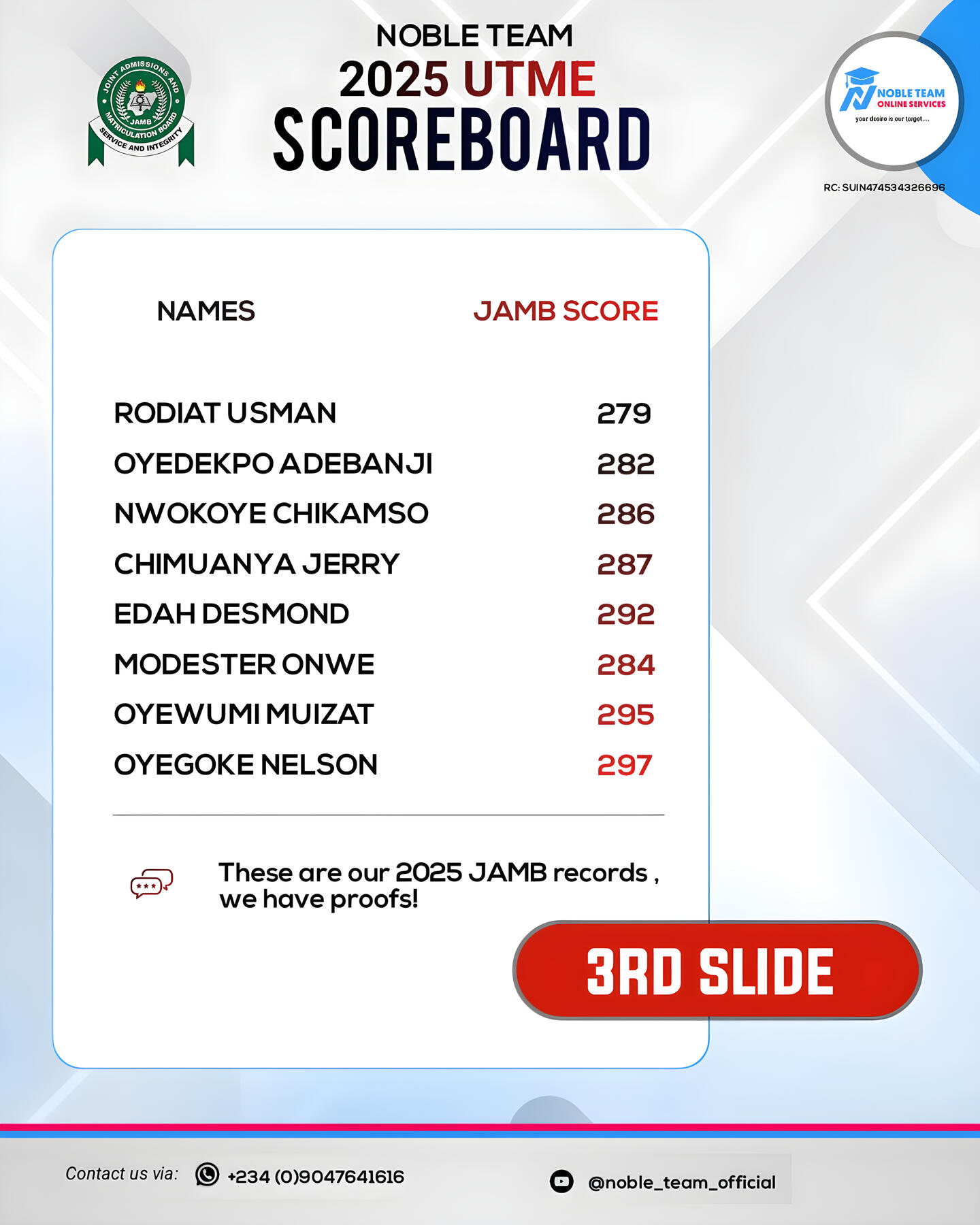 Please note: All the students highlighted here registered for our PAID JAMB classes in 2025 and went on to smash impressive scores ranging from 230 to 300+.