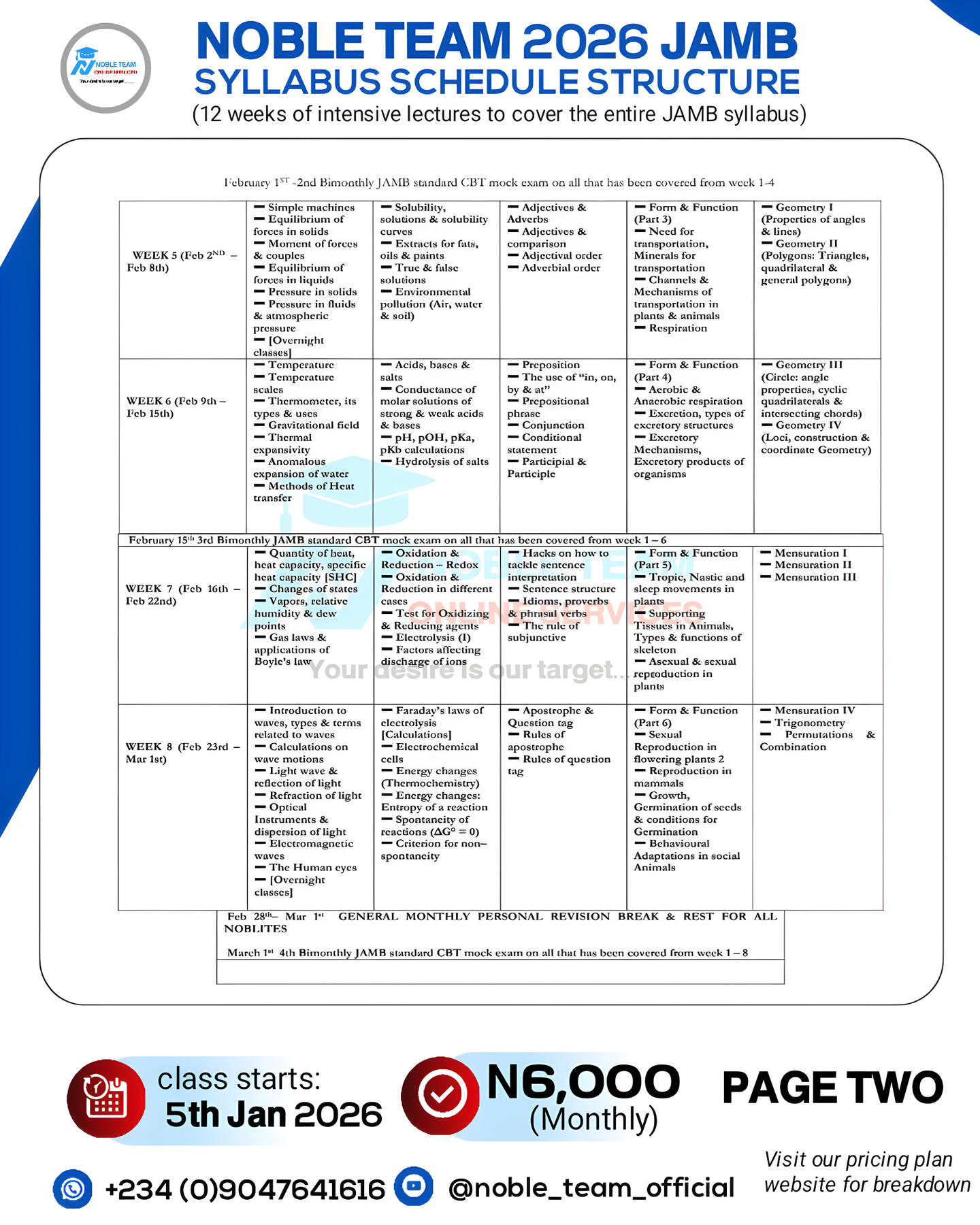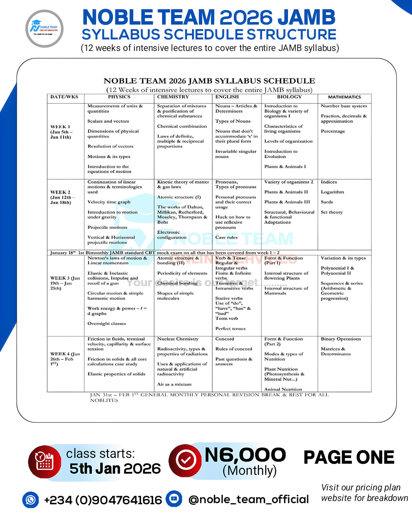Many students fail JAMB not because they arenât smart, but because they havenât fully mastered the topics in the official syllabus. You donât have to be one of them.At Noble Team 2026 JAMB Classes, weâll take you through the entire syllabus from scratch all the way to the end, following the official 2026 JAMB syllabus closely. Youâll gain the knowledge, practice, and confidence you need to tackle the exam without fear.And thatâs just the beginningâkeep scrolling to see the extra tools and resources weâve prepared to make sure you smash your 2026 JAMB once for all.