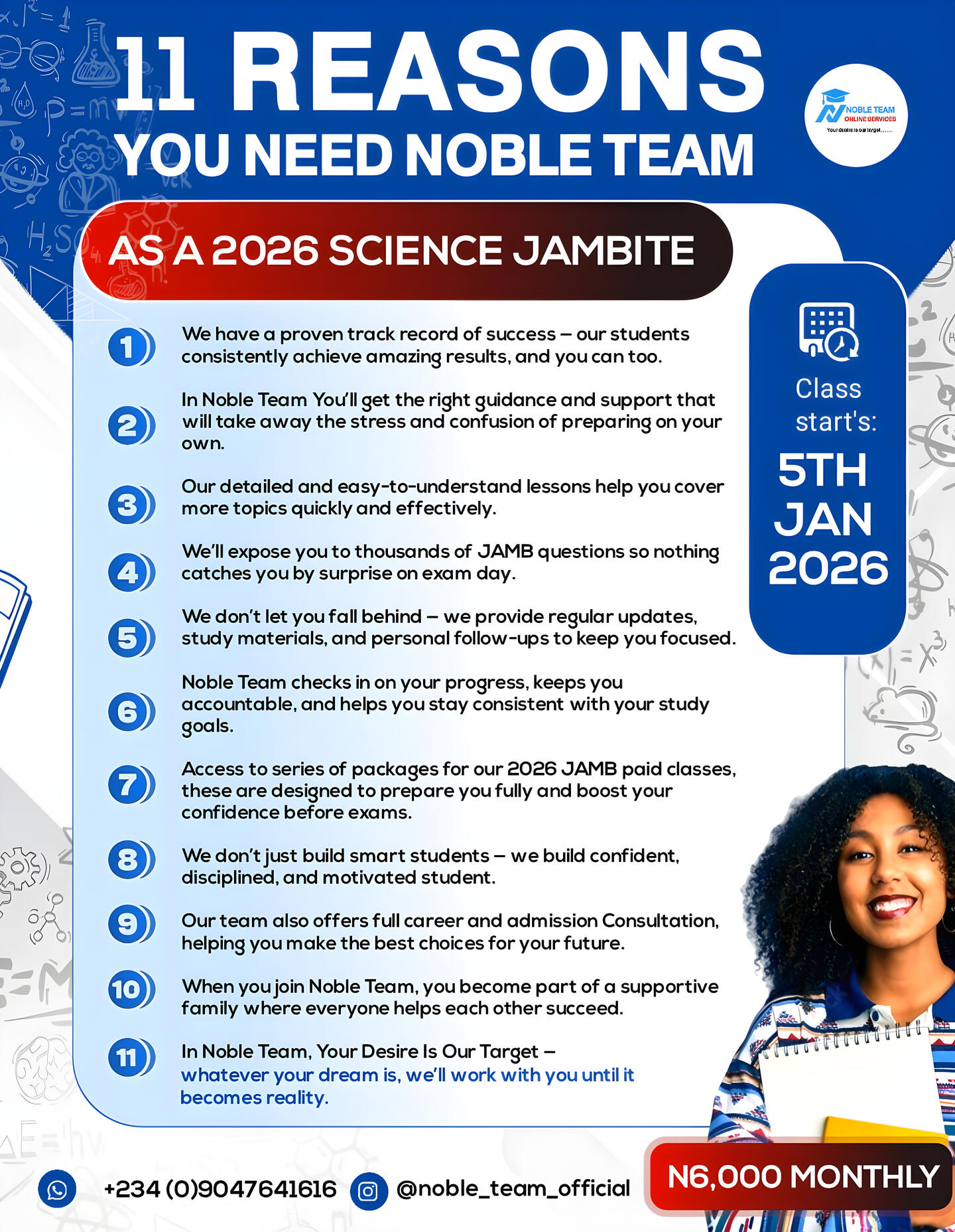 There are countless reasons to join Noble Team, but weâve prepared 11 solid and unique reasons that really set us apart. Take a moment to read them carefully,donât rush because each reason is designed to show you exactly why our 2026 JAMB classes are your best choice.