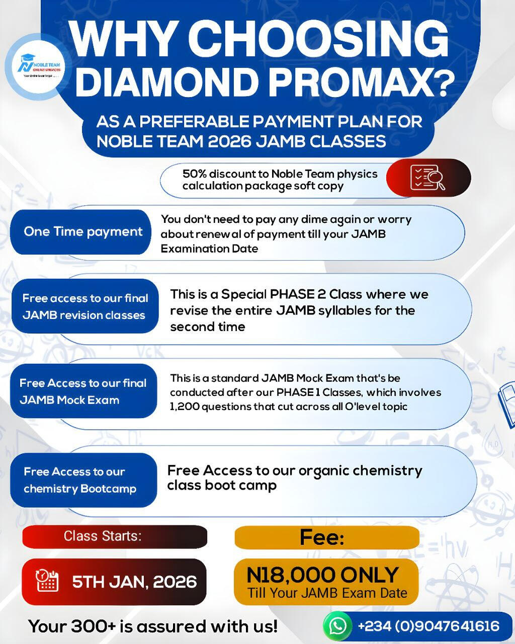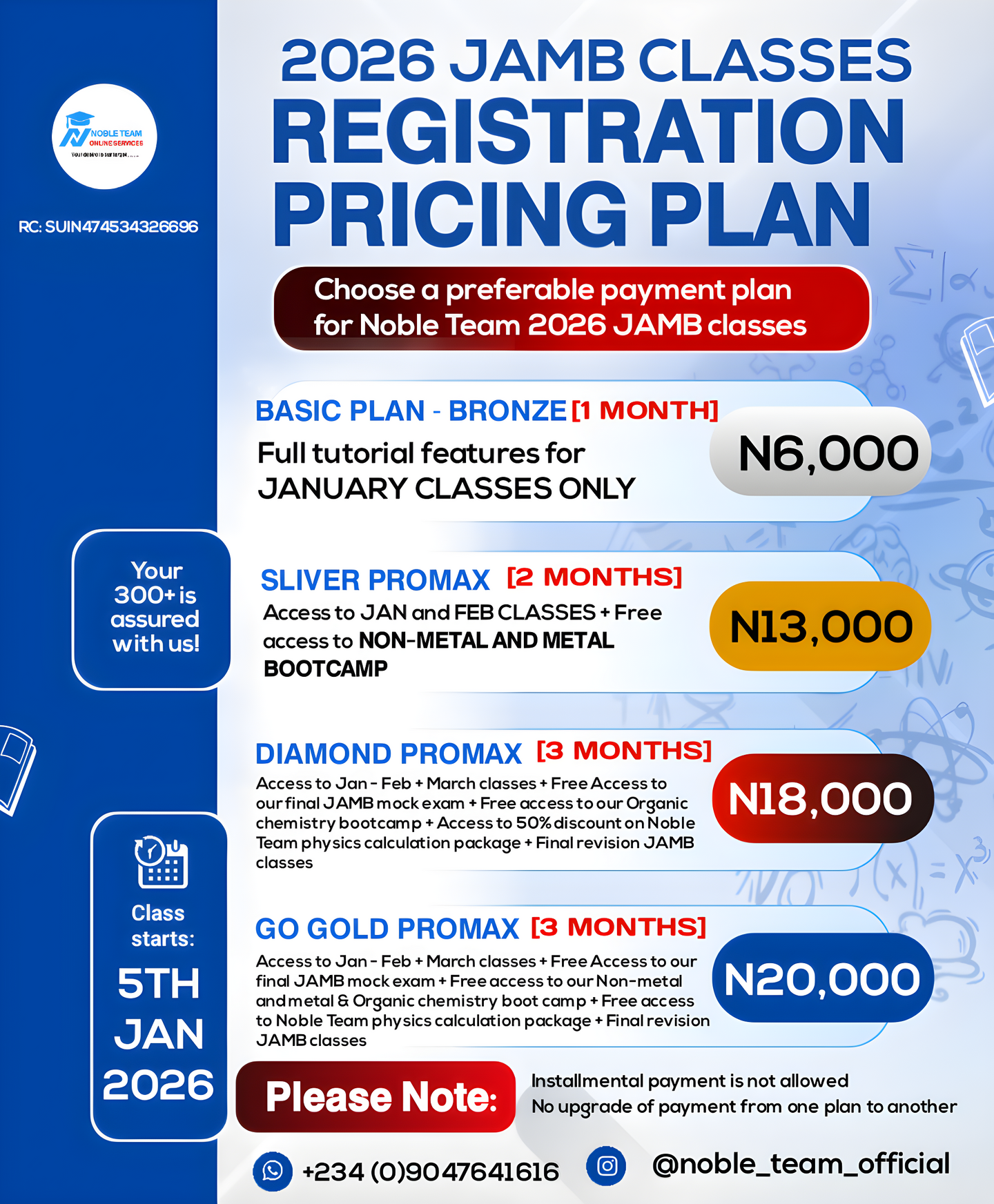 This is a three month registration plan where you will have full access to January, February and march classes, free access to our Organic chemistry marathon class 3.0, free access to our final JAMB mock exam, free access to our final JAMB revision class PHASE 2 starting April and 50% discount on Noble Team physics calculation package (soft copy), the fee for this plan is N18,000