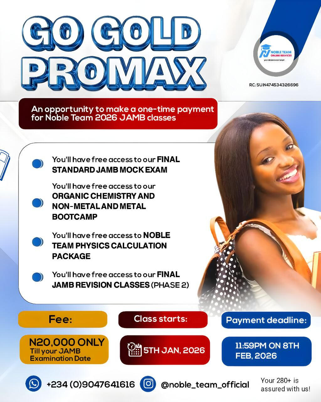 The Go Gold Promax Plan is a special payment option that covers the entire lecture period for the 2026 JAMB classes in Noble Team.With a one-time payment of just âŚ20,000, youâll be fully covered from the start of classes till your JAMB exam in April â no renewals, no interruptions, and no worries.