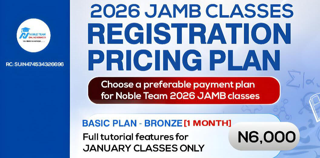 We know how easy it is to get distracted during tutorial periods â life happens! Thatâs why, at Noble Team, weâve created a strong follow-up and accountability system to keep you consistent with your classes and reading progress.With everything weâve put in place, thereâs absolutely no reason a serious student in Noble Team wonât crush the 2026 JAMB!Keep scrolling to see more about our 2026 JAMB Paid Class and how you can join this winning team.
