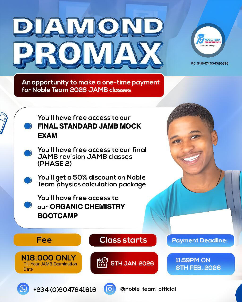 In less than two weeks, youâll start transforming into the scholar youâve always wanted to be! Thereâs simply no way you can prepare yourself like Noble Team will prepare youâthatâs a fact.Missing our powerful 2026 JAMB classes would be taking a huge riskâone that could lead to failure and repeating JAMB in 2027. Donât let that happen. Join us now and give yourself the best chance to succeed!