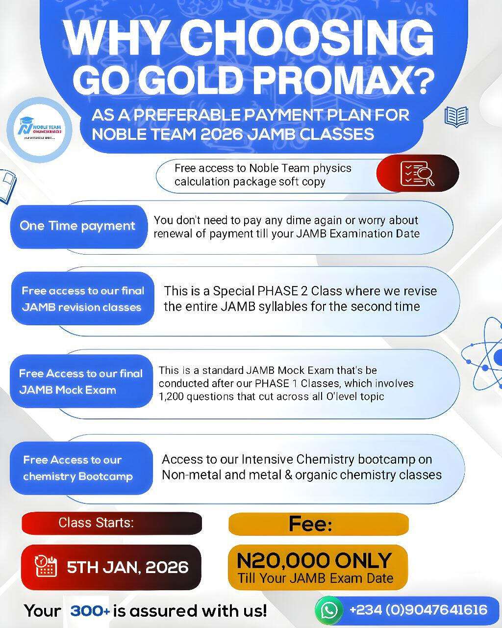 The Go Gold Promax payment plan gives you access to January - march classes , free access to our Organic Chemistry marathon 3.0, free access to our final revision class in April , free access to our final JAMB mock exam, free access to our metal and nonmetal marathon class 2.0 and free access to Noble Team physics calculation package (soft copy).